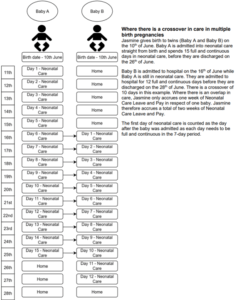 Where there are multiple births, for example twins or triplets, overlapping care of seven or more days will count as one entitlement period regardless of how many babies spend time in neonatal care. Where a baby has multiple admissions, but no overlapping care, this will be classed as separate entitlements, and an employee may have multiple periods of leave and pay.